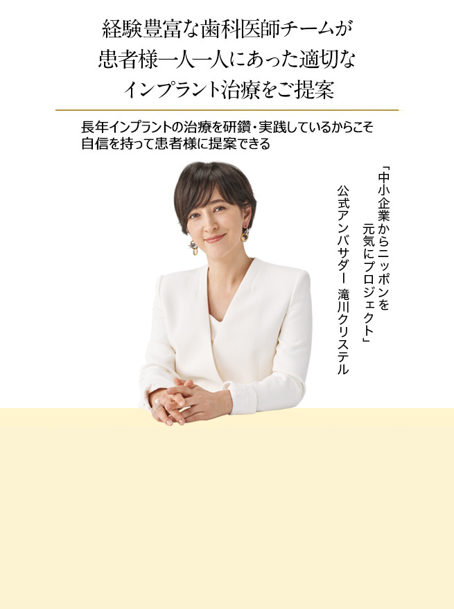 多くの患者様から上記のようなお悩みをお聞きする度に「歯を失うことによって、人生の楽しみが少なくなってしまっている」と感じます。そして、「患者様ご自身の歯で自由に噛めるようになるインプラント治療は、人生を再び楽しめるようになるための解決策である」と確信します。